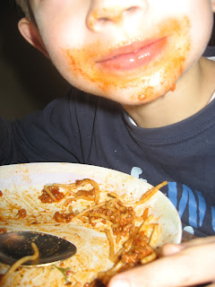 Większy K. spałaszował właśnie spaghetti z sosem bolońskim własnej roboty. Makaron musi być gotowany w pełnym wymiarze, a ja mam widowisko obserwując jak sobie z nim potem radzi. Nooo, coraz lepiej :D